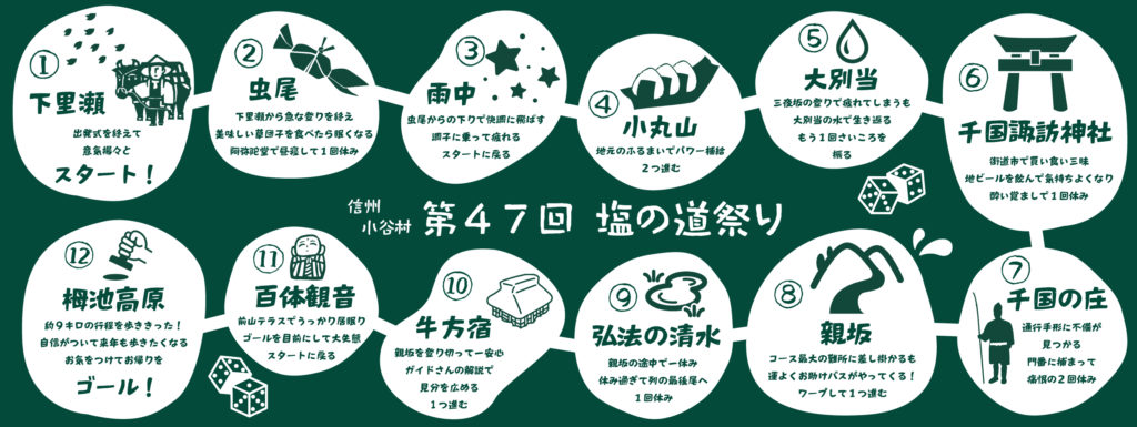 今年の手ぬぐいのデザインが決定しました!今年は塩の道祭りで歩くルートを「すごろく」に仕立ててみました。しかも、募金をしていただいた方に配布している「飴」を「サイコロ」に替える徹底ぶり!今年は手ぬぐいで「すごろく」を楽しむ姿が見れることを...